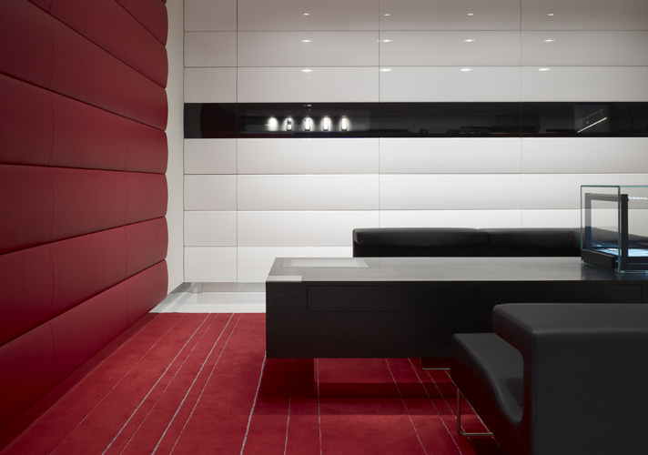 The central zone of the facade folds back into the building to become part of the ground floor ceiling – matte black logos have been silkscreened onto glossy black glass. This black strip terminates on the back wall, where a huge plasma monitor displays images of Vertu’s phones.......more